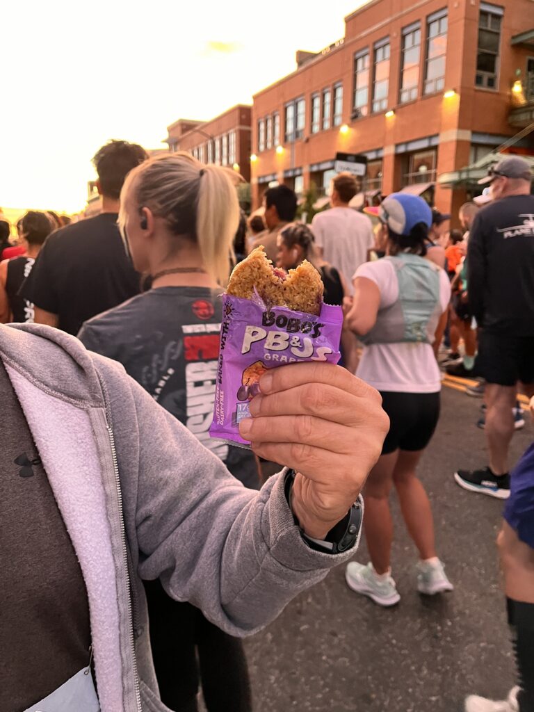 We had to get the last minute fuel in us just before the start. When I was in high school, my “go to” before any soccer game or basketball game was a good old peanut butter and jelly sandwich. Now, Melissa and I rely on our Bobo’s PB&Js before a long run or as a snack on one of our adventurous hikes. And it was good to see so many of the runners using Bobo’s products as well, and happy to see them as a sponsor of the event.