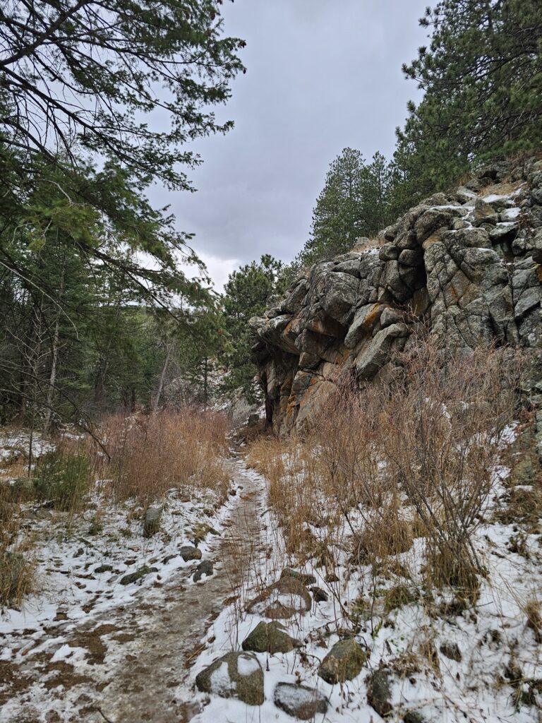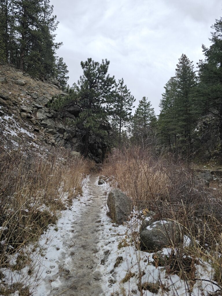 The trail is 1.7 miles one way, with an elevation climb of about 600 feet, and it hugs Fourmile Canyon Creek, crossing over it multiple times. This time of year, any water that might have been flowing was frozen solid, and there were residuals of snow and ice that had recently accumulated. You have to be mindful of each step especially in the winter time. Thankfully, we had decided to use our spikes that we put over our Merrell Moab 3 hiking boots.